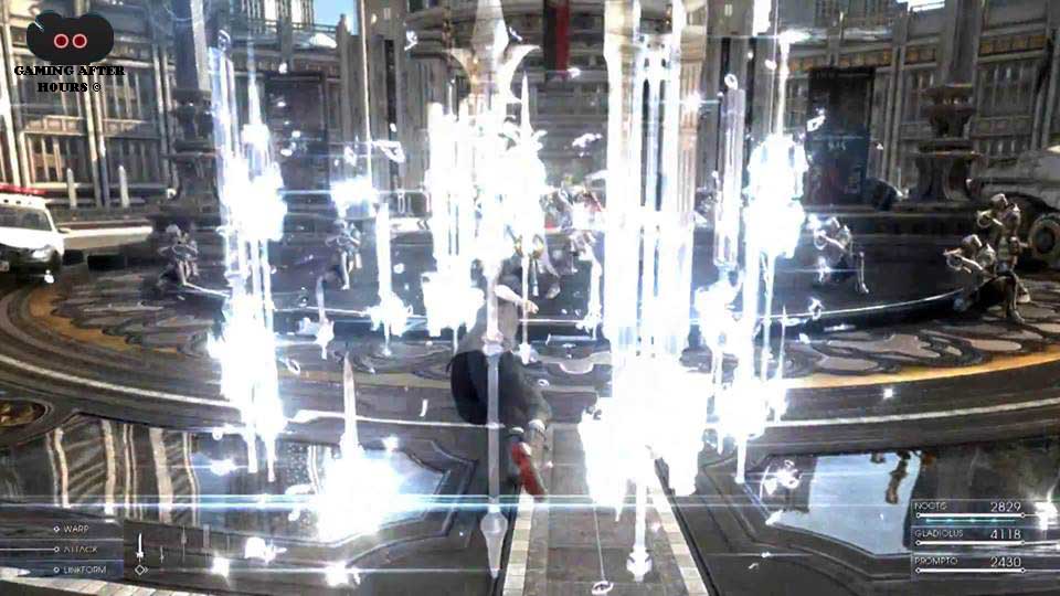 The battle system is like Kingdom Hearts, there is no loading time or transitions. You must control Noctis when fighting similar to Sora from Kingdom Hearts, but Noctis has more than one weapon which in this case, he has an armory with short swords, broad swords, great swords, spears, even guns. During the battle the HUD is placed on the left with three options: Warp, Attack, and Link form; when the toggle button is pressed the menu changed to Item, Magic, and Link Form. Warping and Link Form is brand new in the Final Fantasy franchise.
